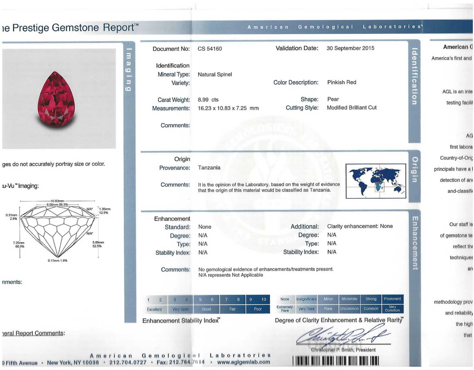 This exceptional ring features a stunning 8.99-carat Mahenge spinel, expertly cut in a pear shape. Known for its vivid pinkish-red hue, this natural spinel from the Mahenge region in Tanzania exhibits remarkable brilliance and clarity, making it a highly sought-after gemstone.