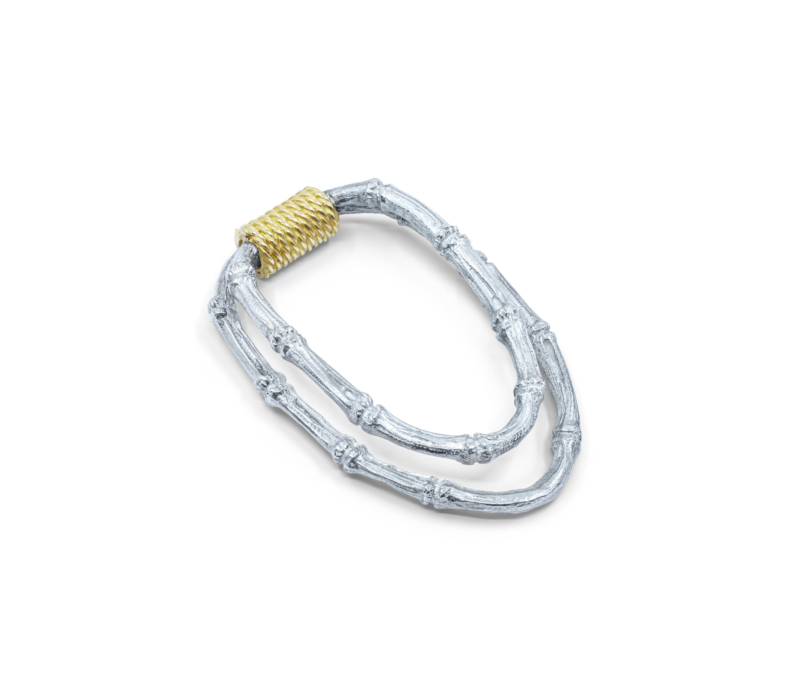 Этот элегантный держатель для купюр из золота и серебра выполнен в виде стилизованных бамбуковых стеблей, связанных витой золотой нитью. Изысканная игра текстур и металлов придает этому изделию естественную силу и утонченность, характерные для французского ювелирного ремесла начала XX века и зарождающейся эстетики ар-деко.